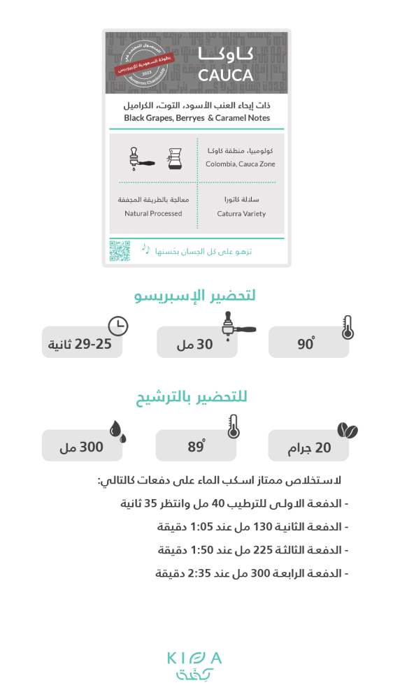 • تتميز هذه القهوة بطيف واسع من الايحاءات الغنية والمتوازنة و ستشعر بنكهة العنب الأسود المنعشة والتوت اللذيذ الممزوج بنكهة الكراميل الرقيقة، مما يضفي على كل كوب قهوة تجربة مدهشة وممتعة.