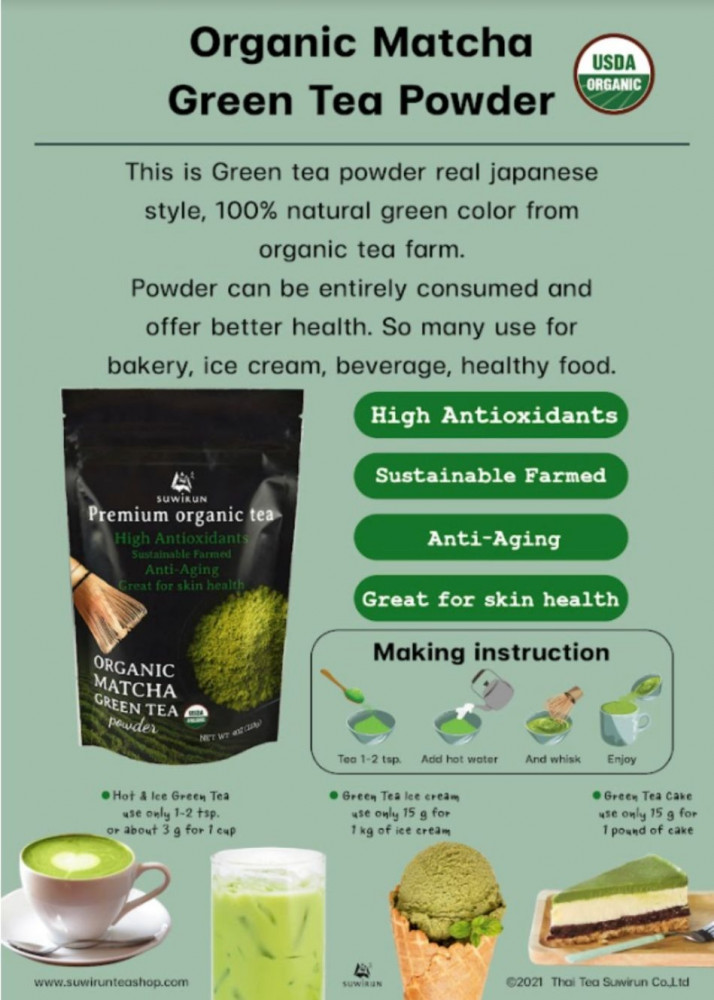 - فوائد صحية: يُعد الشاي ماتشا خياراً صحياً رائعاً، حيث يحتوي على نسبة عالية من الأنتي أوكسيدانت والفيتامينات والمعادن، وخاصة الحديد والكالسيوم والبوتاسيوم. كما أنه يحتوي على مضادات الأكسدة التي تساعد على محاربة الأمراض المزمنة، وتعزيز صحة الجهاز الهضمي وانخفاض مستويات السكر في الدم.