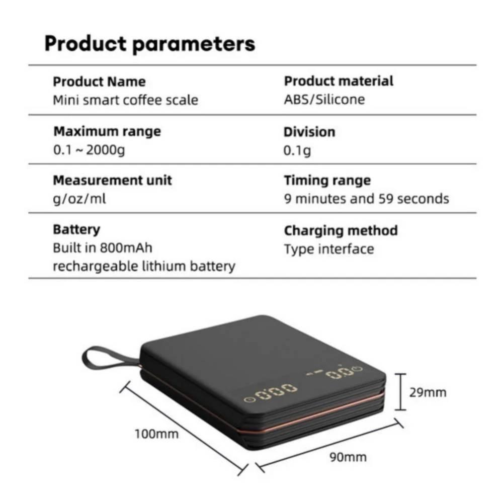 ميزان قهوة صغير يناسب معظم ماكينات الإسبريسو : ميزان قهوة محمول صغير يناسب راحة يدك. الحجم 100*90*29 مللي متر.